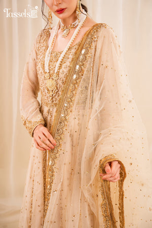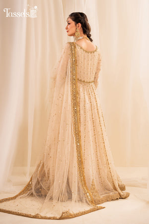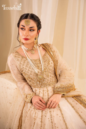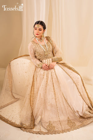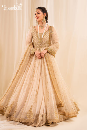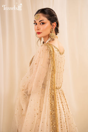 An ivory embellished kalidar, handcrafted using resham, dabka, tilla, zardozi and sitara. This breathtaking bridal dress, with its 28 kalis and handcrafted design, is as unique and beautiful as the bride who wears it."