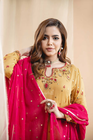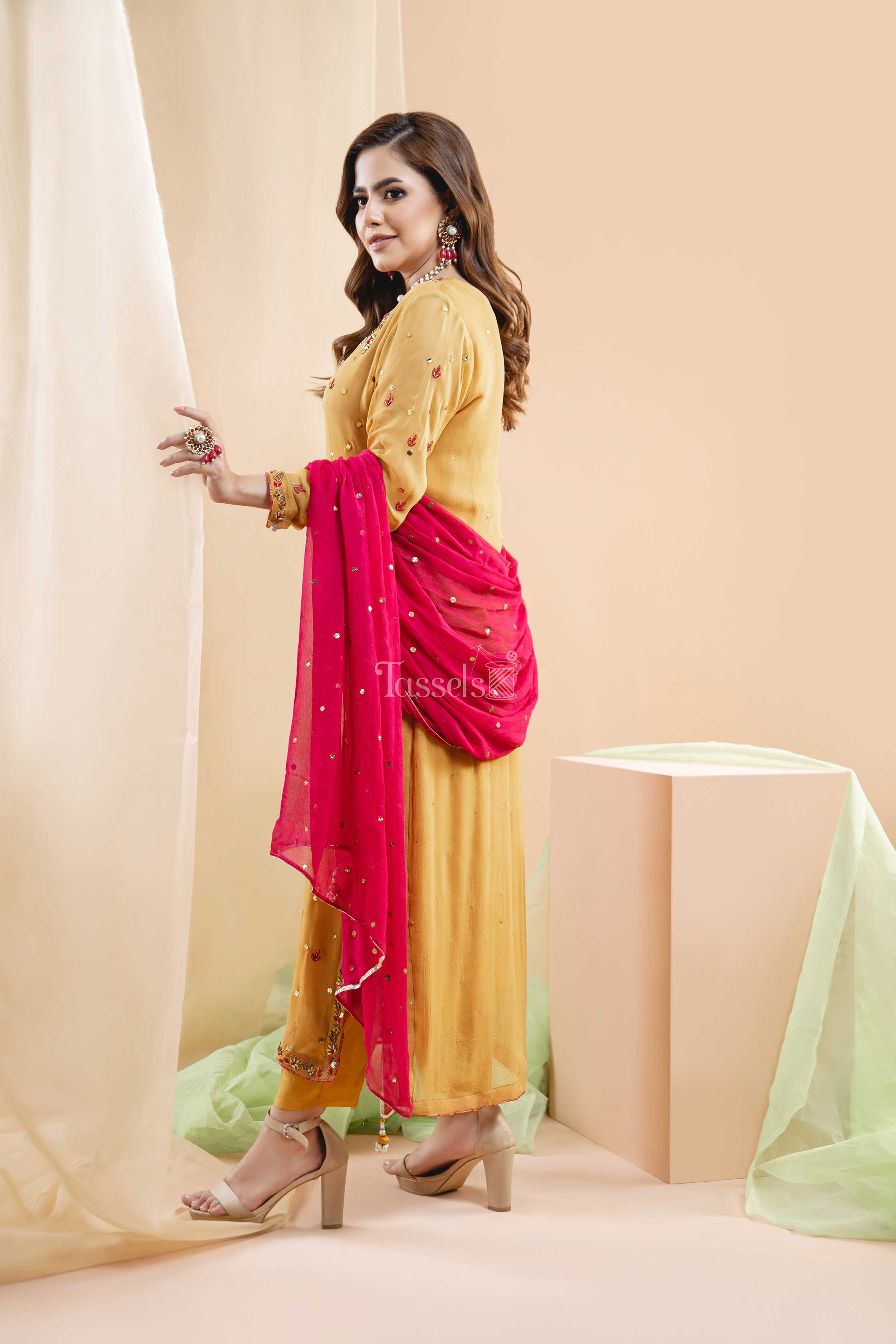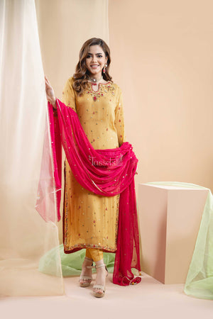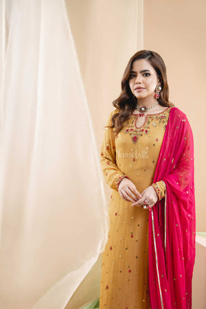 Soft yet subtle ensemble in pure chiffon with heavy kamdani sequins threadwork on shirt along with pure kamdani dupatta and straight raw silk pants for a flawless Festive look!
