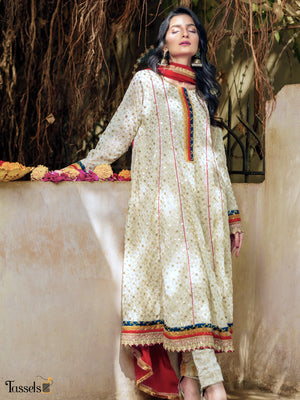 White Sequins embroidered flyer shirt with zari embroidery all over completed with gorgeous multi sequins borders, paired with straight jamawar pants and chiffon dupatta.