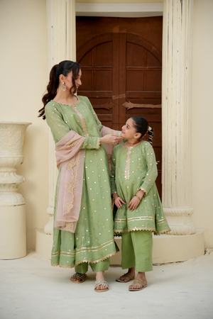Elegant 3-piece matching outfits for mother and daughter. Features embroidered chiffon with attached lining, paired with a luxurious zari organza dupatta and a complete coordinated look. Ideal for festive and formal occasions.