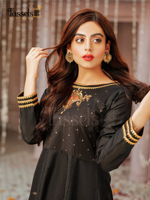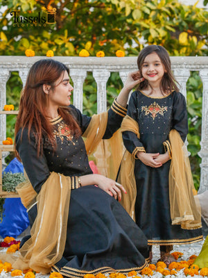 Hand embroidered gota work raw silk along raw silk trouser and net duppata.