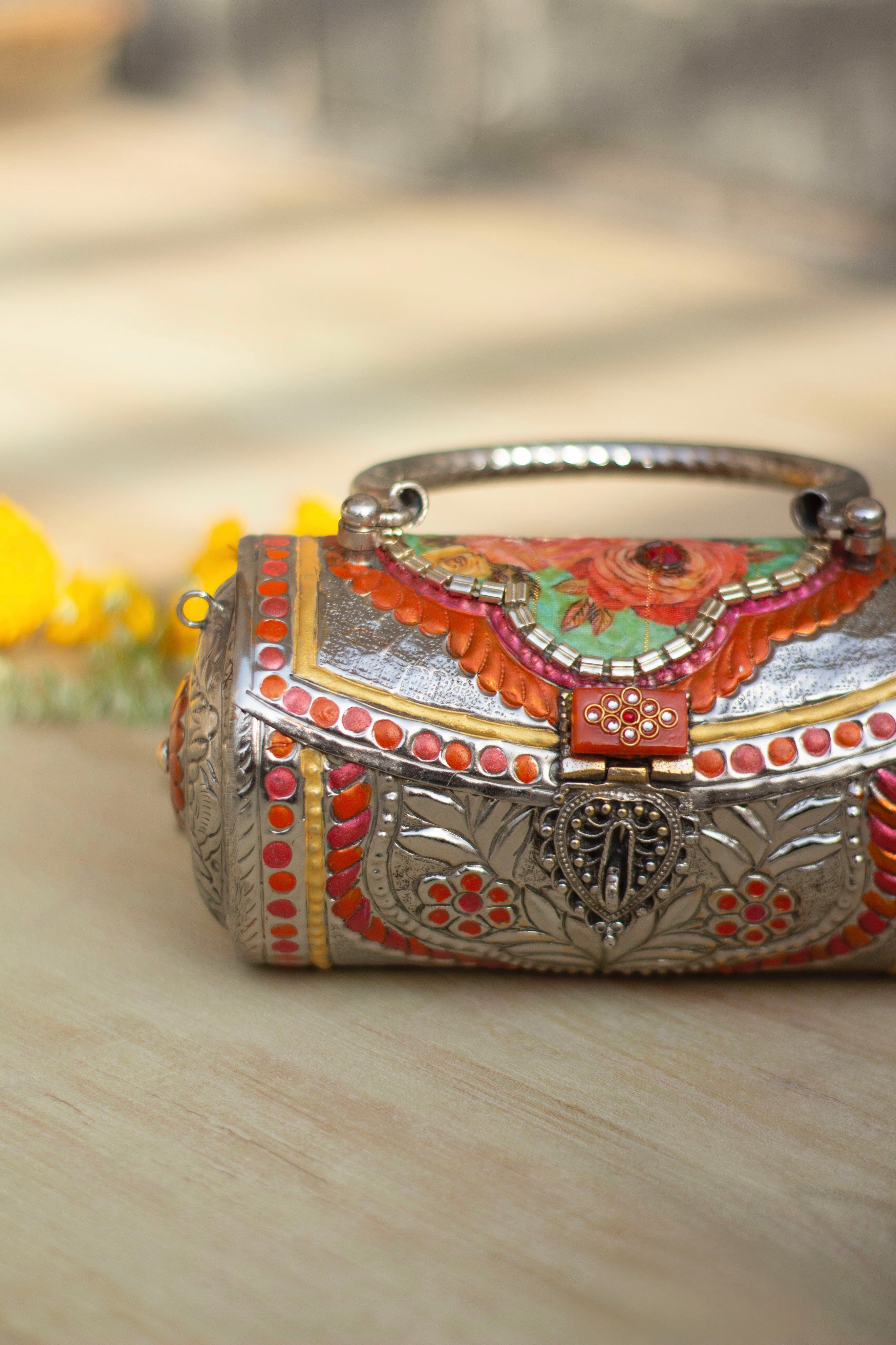 Exclusively handcarved metallic bag handpainted and adorned with jewels and stones. inside is lined with a velvet cloth. Perfect for this festive season