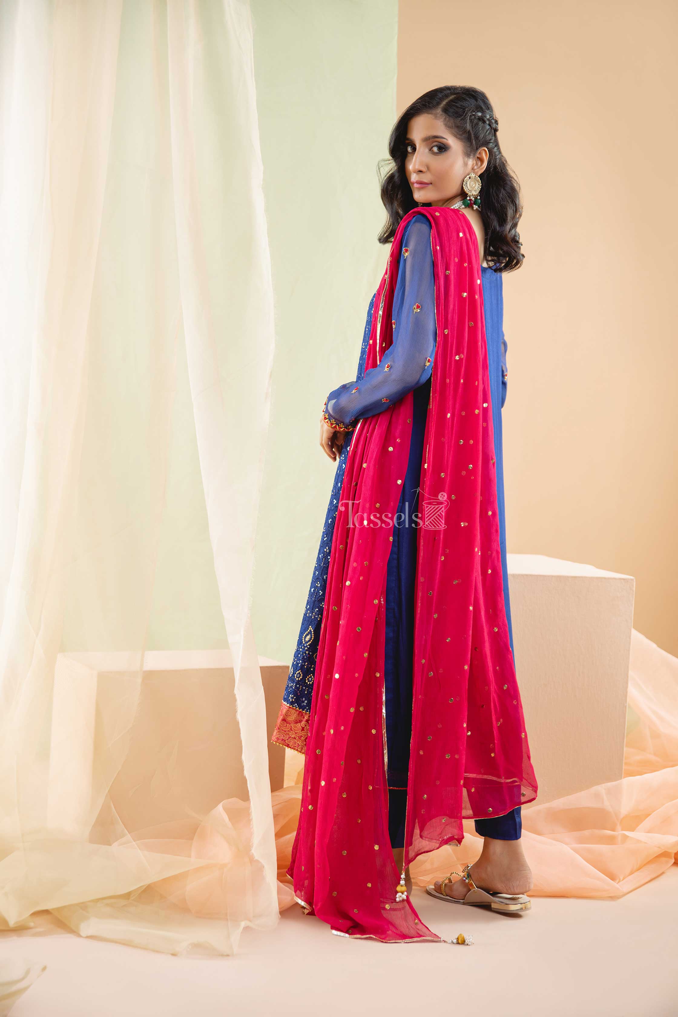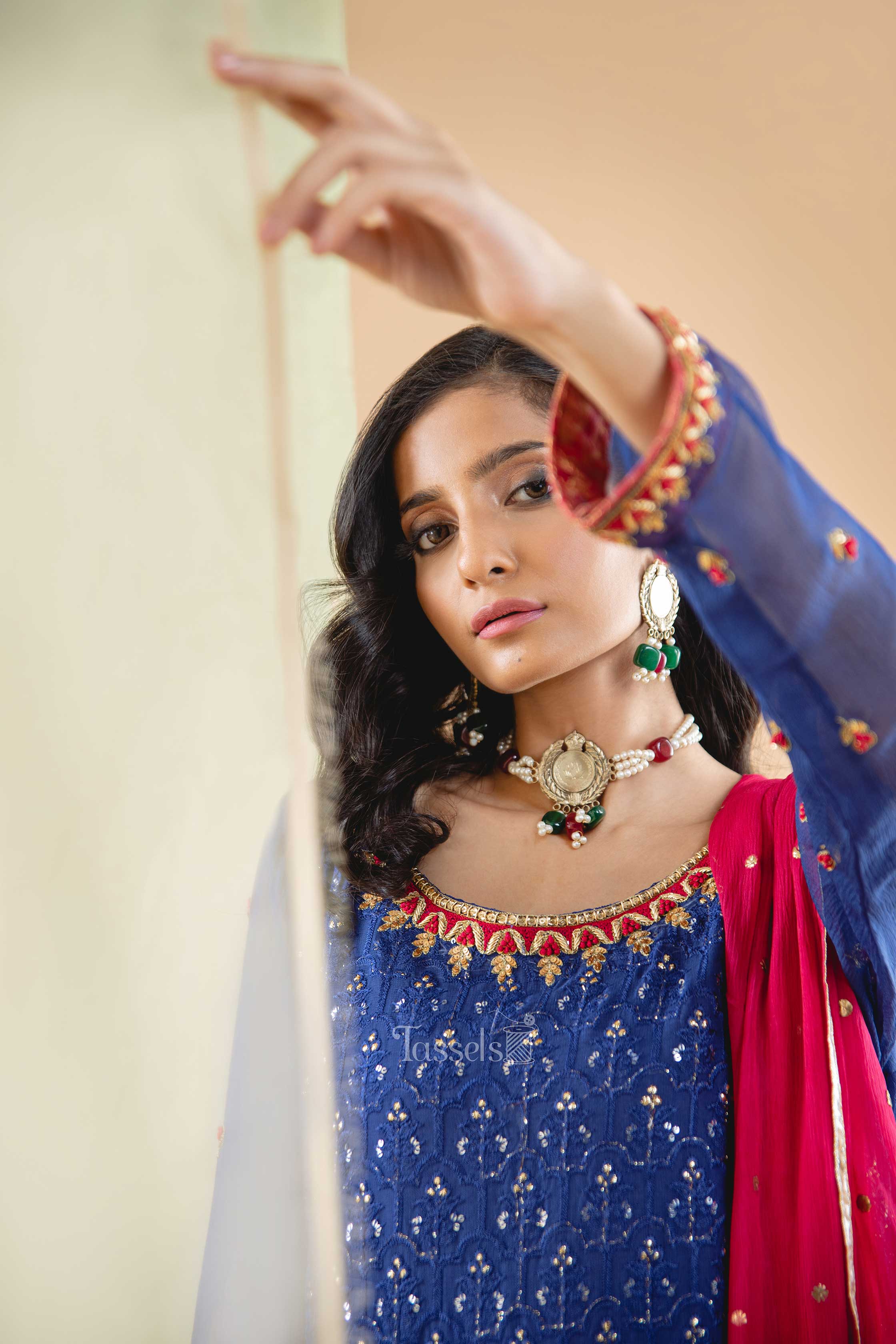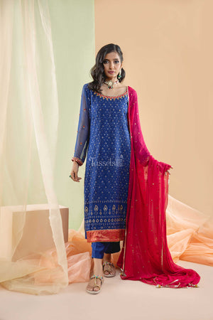 Reveal your aura in this fresh blue fully heavy sequins embroidered chiffon shirt along with hand-embroidered zardozi and sequins work on sleeves and necklines. It has straight raw silk pants along with a pure kamdani dupatta which will be definitely your top pick in this festivity!