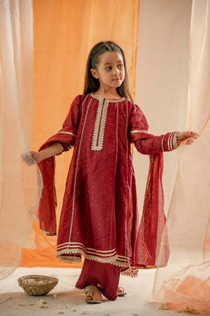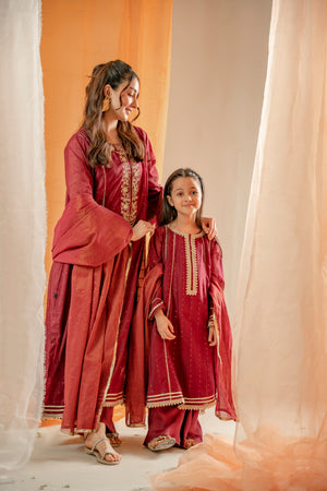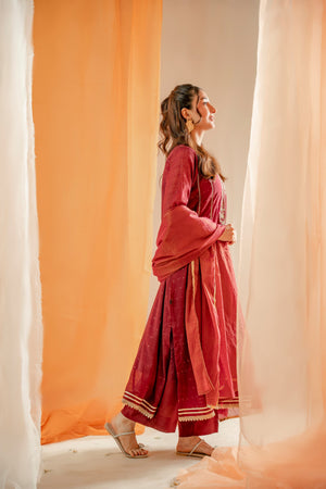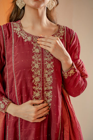 The article features a long, flowy frock in a pinkish maroon color. It is adorned with zari embellishment on the neckline, giving it an elegant touch. The fabric used is a self-zari cotton-lawn, which adds a subtle sheen to the overall appearance. The ensemble is complete with a matching dupatta and trouser, providing a coordinated and sophisticated look.