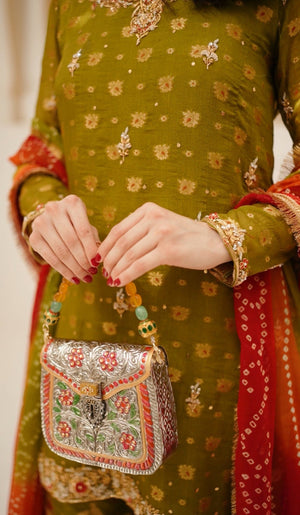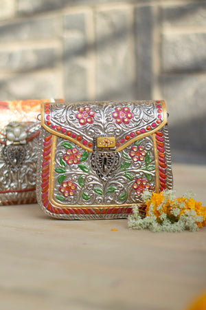 Exclusively handcarved metallic bag handpainted and adorned with jewels and stones. inside is lined with a velvet cloth. Perfect for this festive season