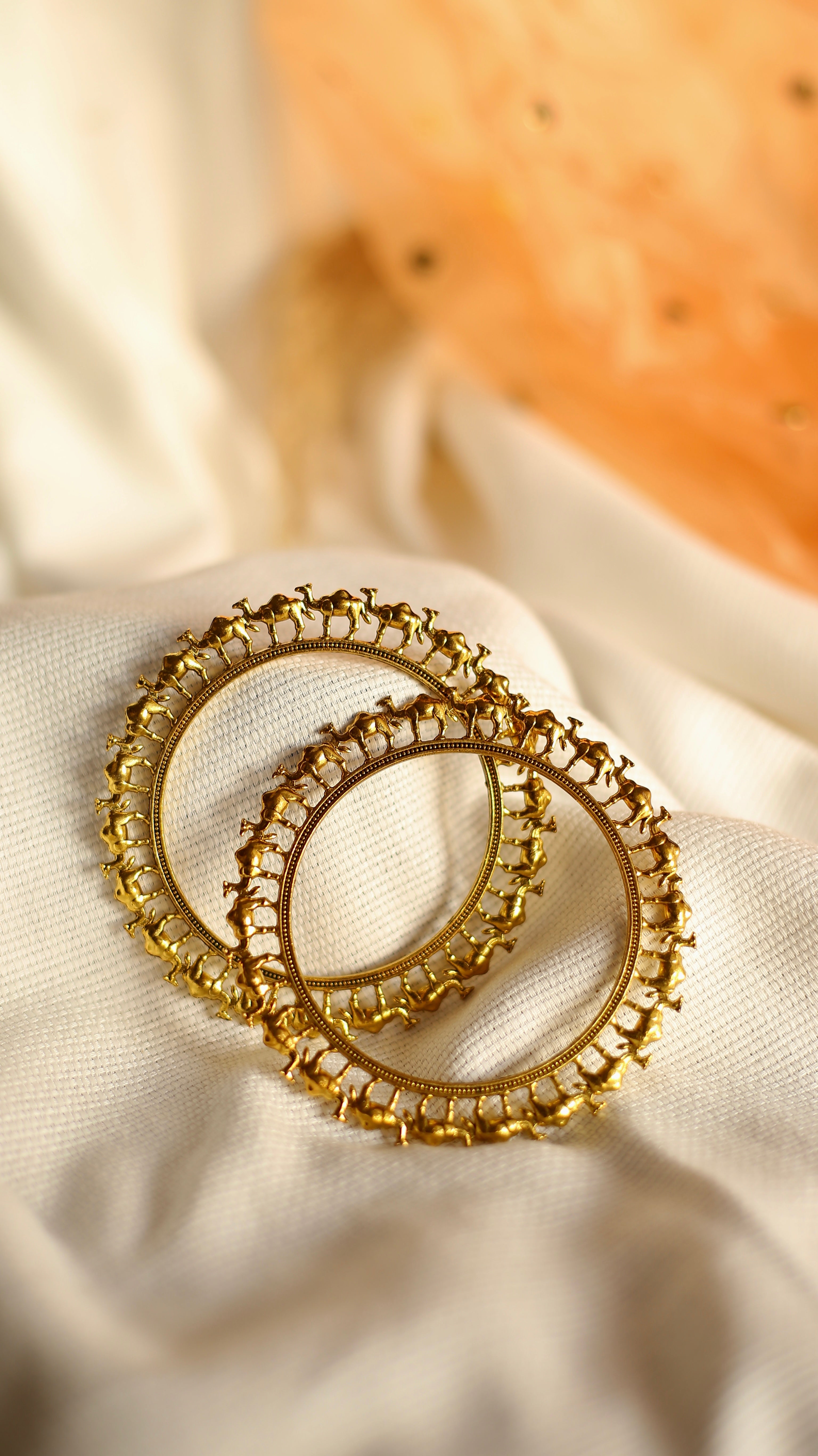 German silver Oxidised Camello bangles, a set of two, exemplifies a blend of traditional craftsmanship and contemporary design. This kada set draws inspiration from Jaipur's rich cultural heritage, celebrated for its distinctive jewellery designs. Made with high-quality silver plating, the bangles showcase intricate camel motifs skillfully carved into the surface.