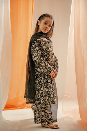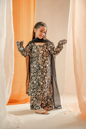 The article consists of a black and beige printed lawn cotton shirt and trouser set. It features very elegant tassels on the neckline and milky lace detailing all over the dress, adding a touch of sophistication. The outfit is complemented by a chiffon dupatta, making it a perfect choice for summer due to its lightweight and breathable fabric.