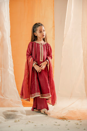 The article features a long, flowy frock in a pinkish maroon color. It is adorned with zari embellishment on the neckline, giving it an elegant touch. The fabric used is a self-zari cotton-lawn, which adds a subtle sheen to the overall appearance. The ensemble is complete with a matching dupatta and trouser, providing a coordinated and sophisticated look.