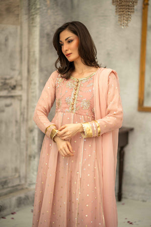 A perfect ready-to-wear outfit featuring a long flared frock crafted in chiffon, adorned with delicate zari embroidery all over. The bodice is enhanced with sequin work and gota buttons, complemented by intricate gota detailing on the borders and sleeves. Paired with a chiffon dupatta finished with detailed gota borders, this ensemble is ideal for festive occasions.