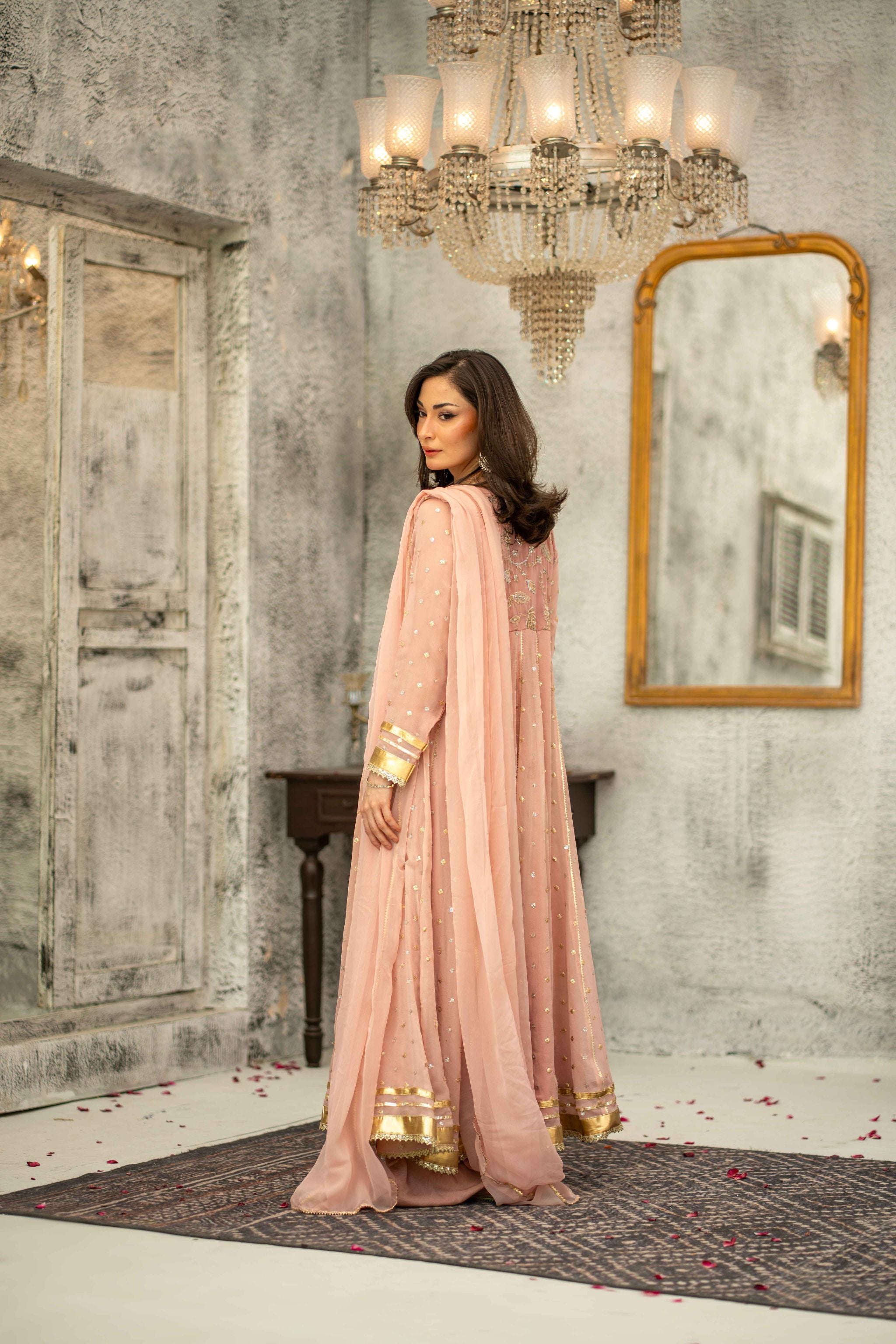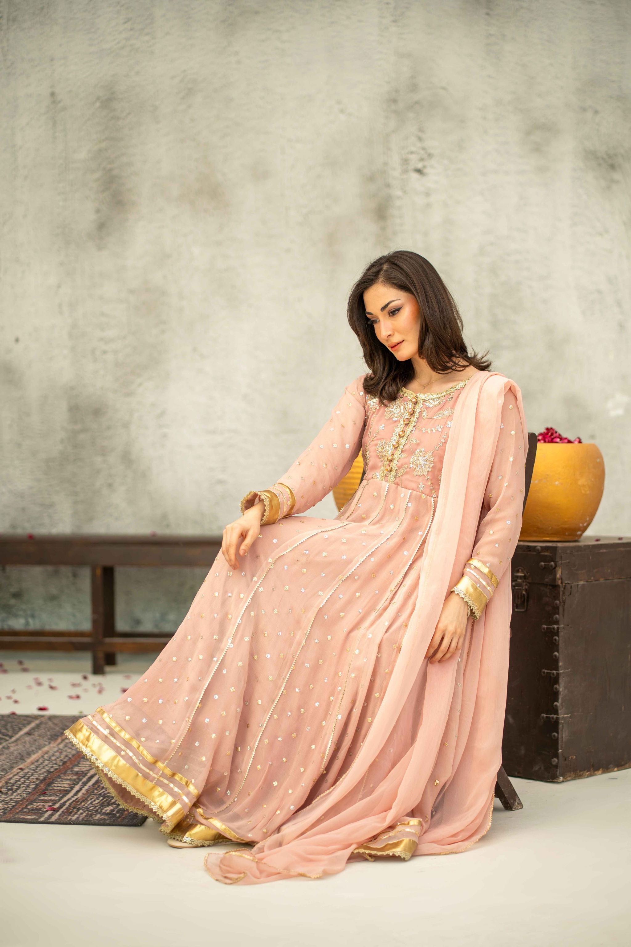 A perfect ready-to-wear outfit featuring a long flared frock crafted in chiffon, adorned with delicate zari embroidery all over. The bodice is enhanced with sequin work and gota buttons, complemented by intricate gota detailing on the borders and sleeves. Paired with a chiffon dupatta finished with detailed gota borders, this ensemble is ideal for festive occasions.