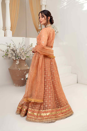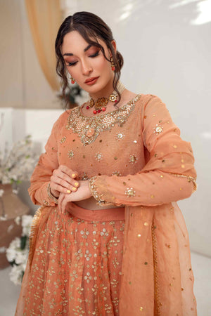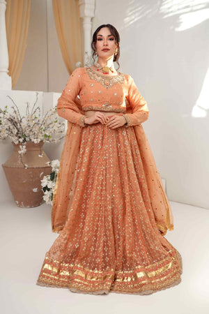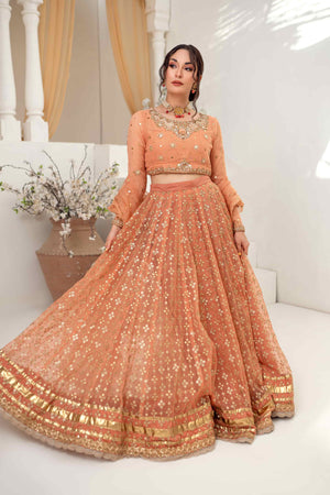 This outfit features a Khaadi net choli adorned with intricate hand embroidery, kora, and dabka work. It comes with a kamdani dupatta and a lehenga embellished with sitara sequences, creating a luxurious and elegant ensemble.