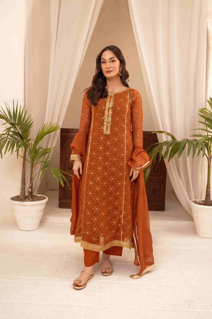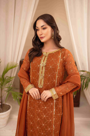 Introducing our exquisite crimson This soft chiffon outfit features a beautifully styled straight shirt with intricate gota detailing on the shirt and neckline, adorned with beads tassels. Paired elegantly with a chiffon dupatta and gold trousers, this ensemble is not only stylish but also comfortable,