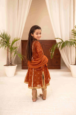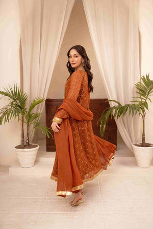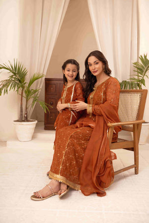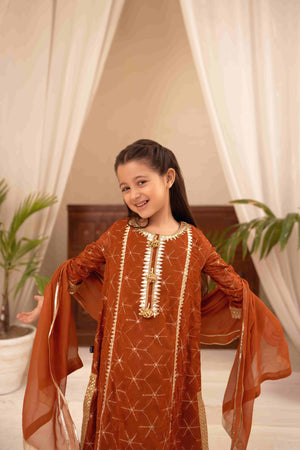 Introducing our exquisite crimson This soft chiffon outfit features a beautifully styled straight shirt with intricate gota detailing on the shirt and neckline, adorned with beads tassels. Paired elegantly with a chiffon dupatta and gold trousers, this ensemble is not only stylish but also comfortable,