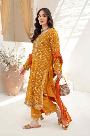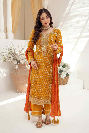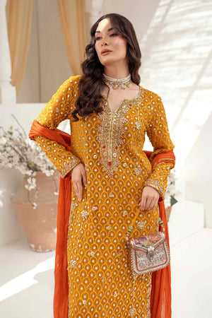 This elegant ensemble features a chiffon shirt embellished with intricate hand embroidery, kora, and dabka work, as well as foil work. It is paired with a rust cotton zari dupatta that adds a touch of richness to the outfit. The ensemble is completed with a trouser adorned with delicate gotta work, creating a beautifully detailed and stylish look.
