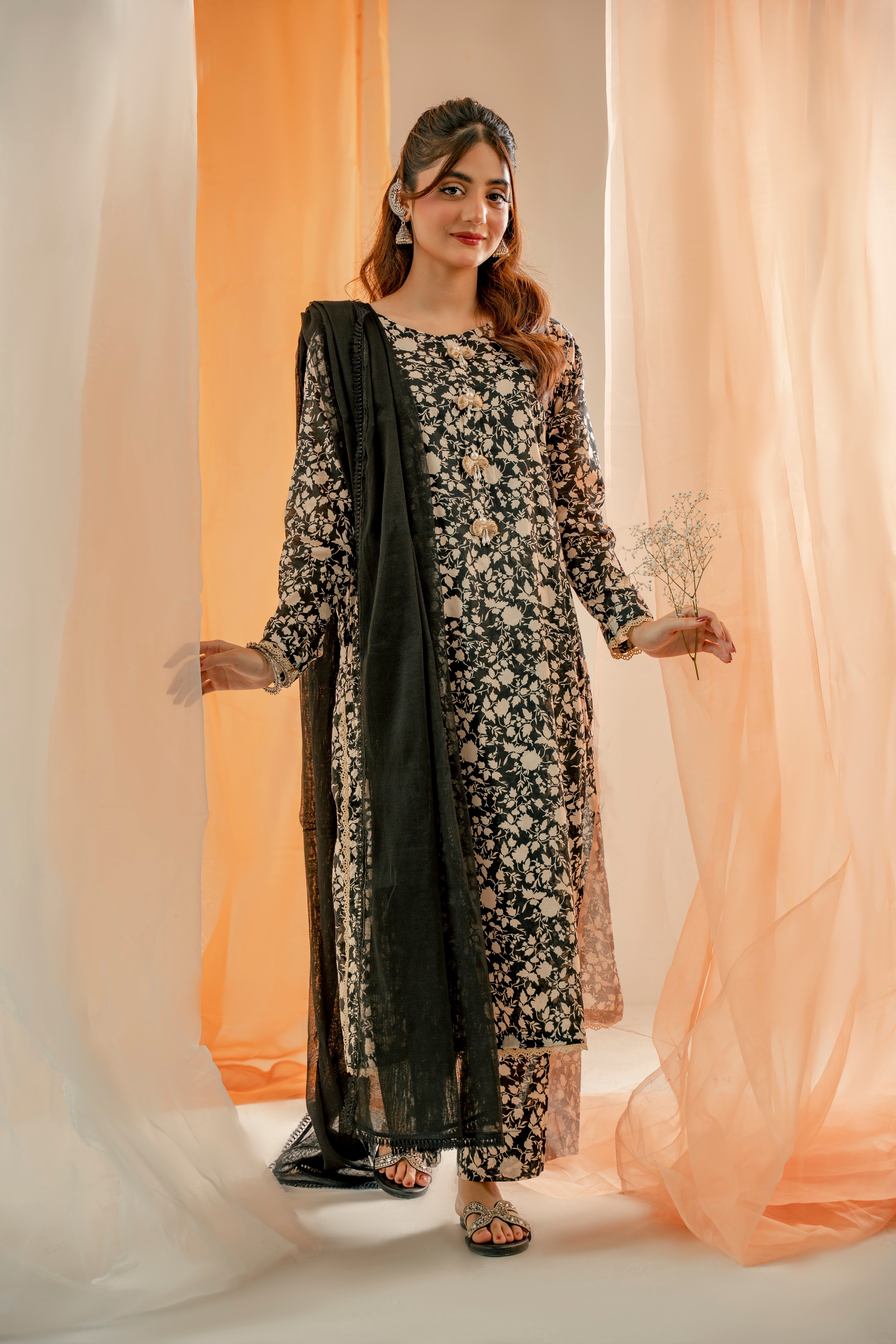 The article consists of a black and beige printed lawn cotton shirt and trouser set. It features very elegant tassels on the neckline and milky lace detailing all over the dress, adding a touch of sophistication. The outfit is complemented by a chiffon dupatta, making it a perfect choice for summer due to its lightweight and breathable fabric.