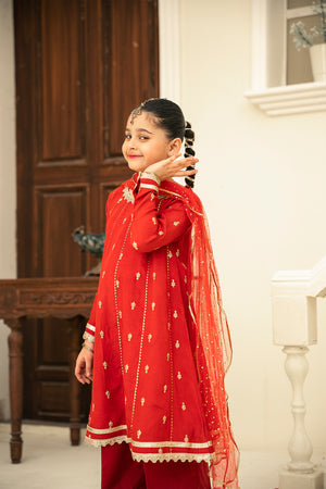 Stylish 3-piece ready-to-wear matching outfits for mother and daughter. Features an embroidered cotton raw silk shirt, cotton raw silk trousers, and a lightweight chiffon dupatta. Perfect for festive celebrations and family gatherings.