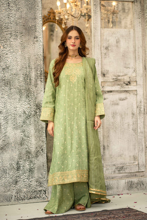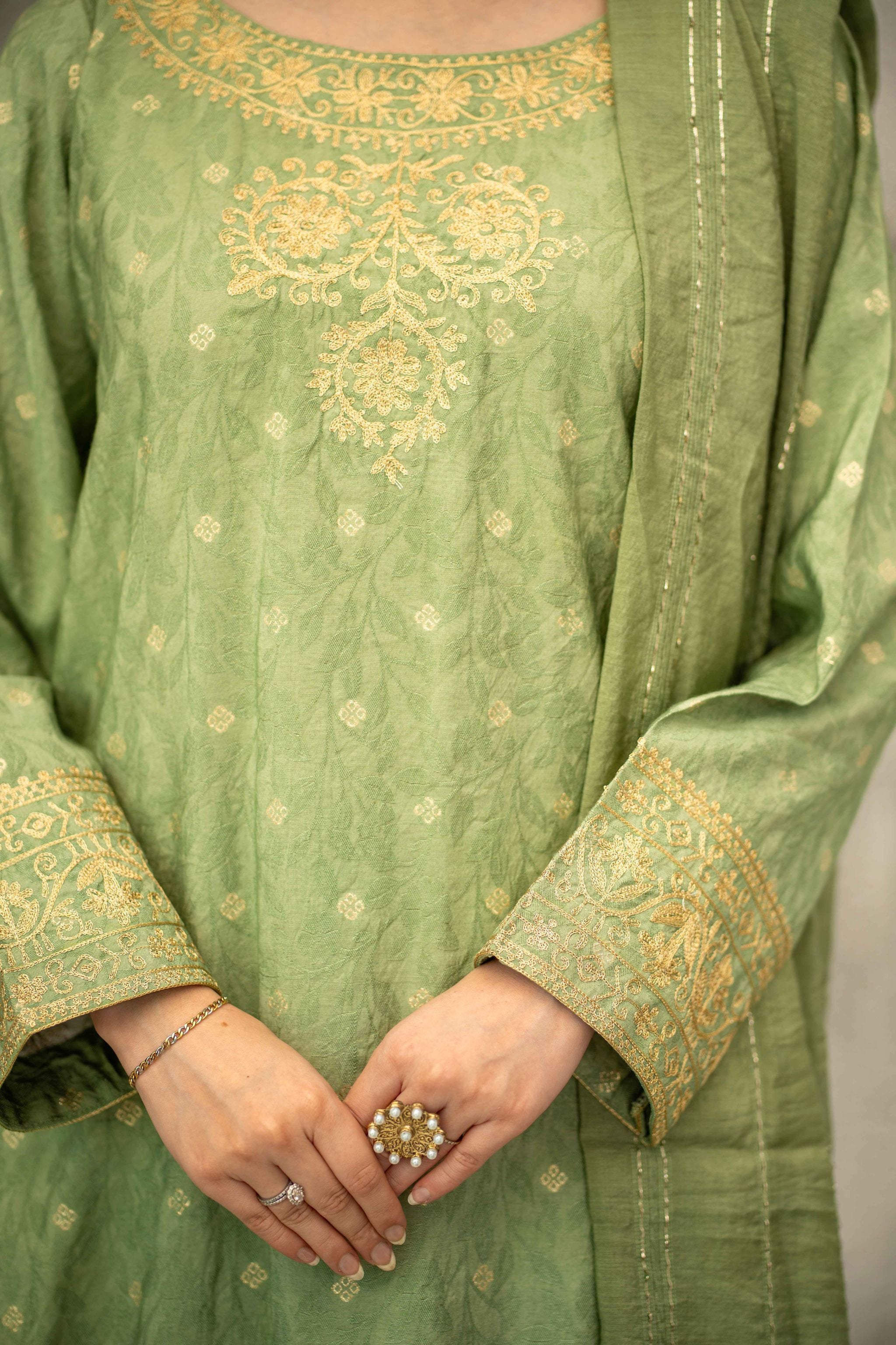 This light bright green outfit features exquisite AriiZari embroidery on the neckline, borders, and sleeves, paired elegantly with a matching trouser and dupatta. Ready-to-wear, it combines festive elegance with comfort.