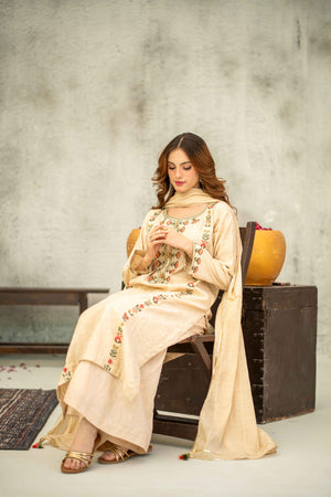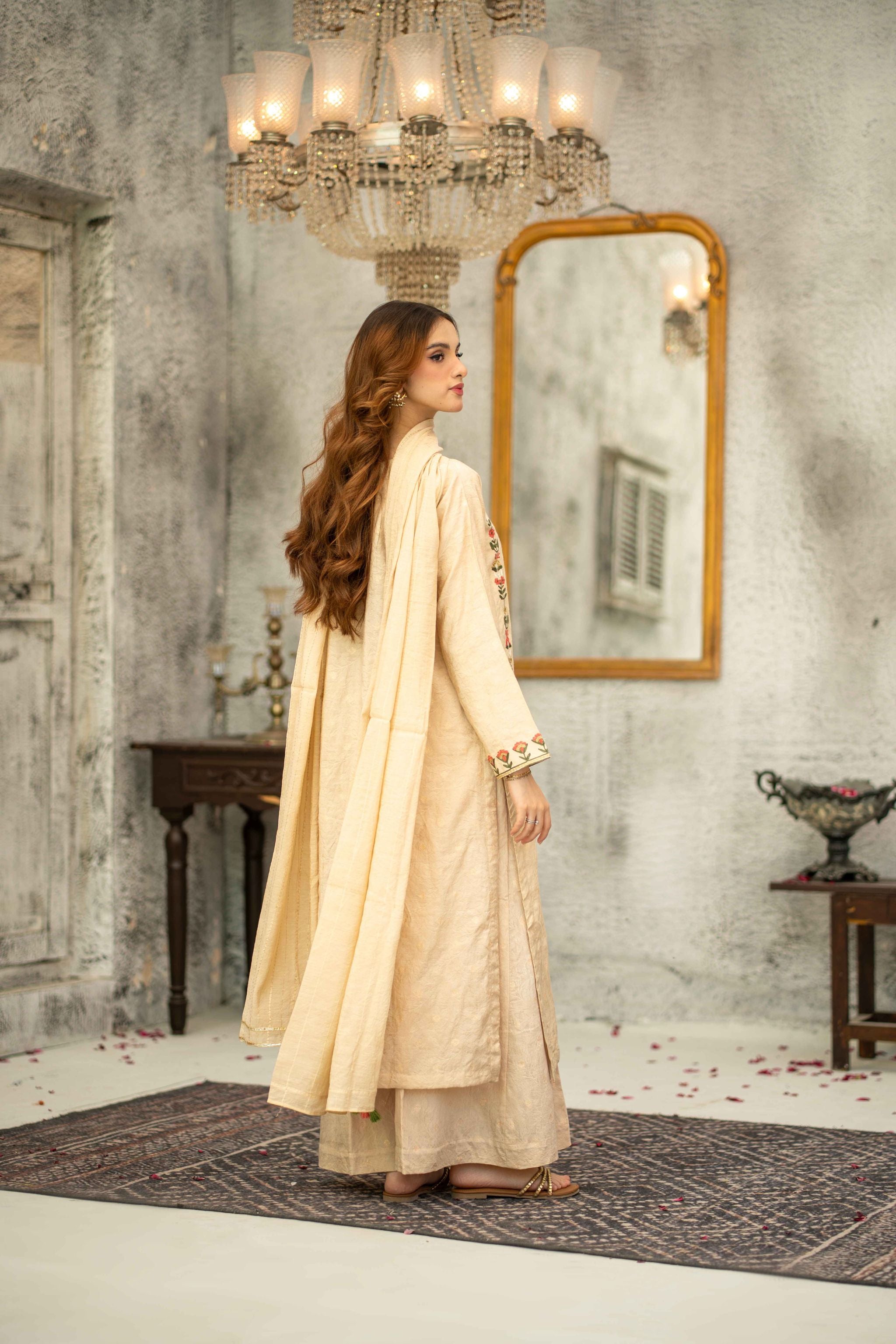 This beige outfit is made from lightweight self Jacquard and features multi-embroidery all over the shirt, creating a subtle yet elegant look. Ready-to-wear, it offers a perfect blend of comfort and style for everyday or casual festive occasions.