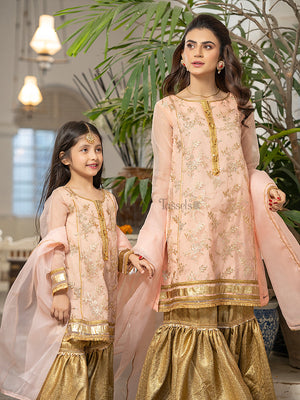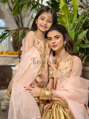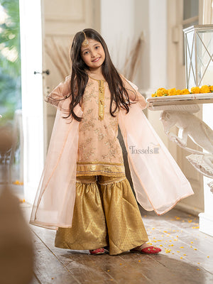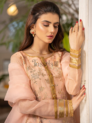 This luxuriously embroidered attire is designed for warm days and fun evenings. Falak is a soft pink embroidered organza shirt with a self cotton garara pants in gold paired with organza dupatta.