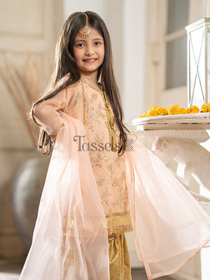 This luxuriously embroidered attire is designed for warm days and fun evenings. Falak is a soft pink embroidered organza shirt with a self cotton garara pants in gold paired with organza dupatta.