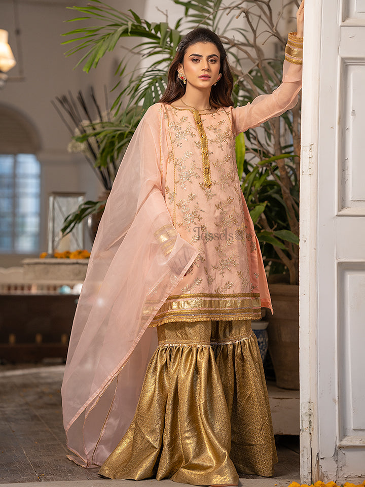This luxuriously embroidered attire is designed for warm days and fun evenings. Falak is a soft pink embroidered organza shirt with a self cotton garara pants in gold paired with organza dupatta.Shirt Fabric: Embroidered Organzam, Bottom Fabric: Self Cotton Atlas, Duppata Fabric: Organza
