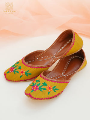 These bright yellow Khussas can be your everyday friend because they are cozy, they are pretty and can make a great pair with any attire. Whether it's a Mayon, you are supposed to attend or just an Event get-together — you can wear these to any event and turn heads because of the delicate and colorful machine embroidery on them