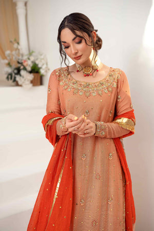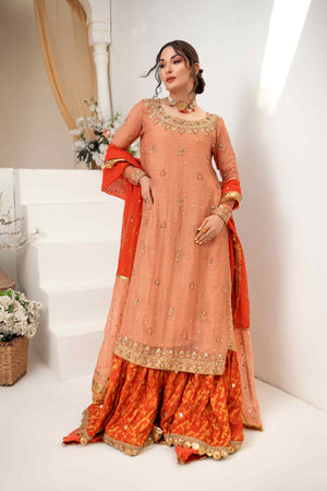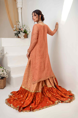 This exquisite outfit showcases a peach heavy kamdani shirt with intricate hand embroidery, featuring kora and dabka work for a touch of luxury. It is complemented by a heavy kamdani dupatta in two contrasting colors, and the ensemble is completed with a rust Jamawar long farshi gharara, creating a traditional and stunning look.