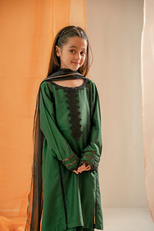The article features a beautiful bottle green outfit made from cotton silk fabric. complemented by delicate laces. The outfit is paired with matching bottle green cotton silk trousers and a dupatta, creating an elegant and cohesive look.