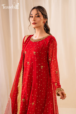 The bottom is straight golden jamawar trouser . This is paired heavy chiffon dupatta. This dupatta is finished with a delicate gotta lace to complete the look.
