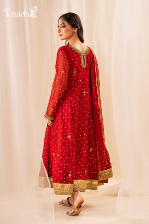 The embellishments is a combination of kora, dabka, zari, pearls, sequins, zardozi and contrasting red and orange resham. The back of the kalidar has an interesting embroidered cut with a dabka and zardozi work