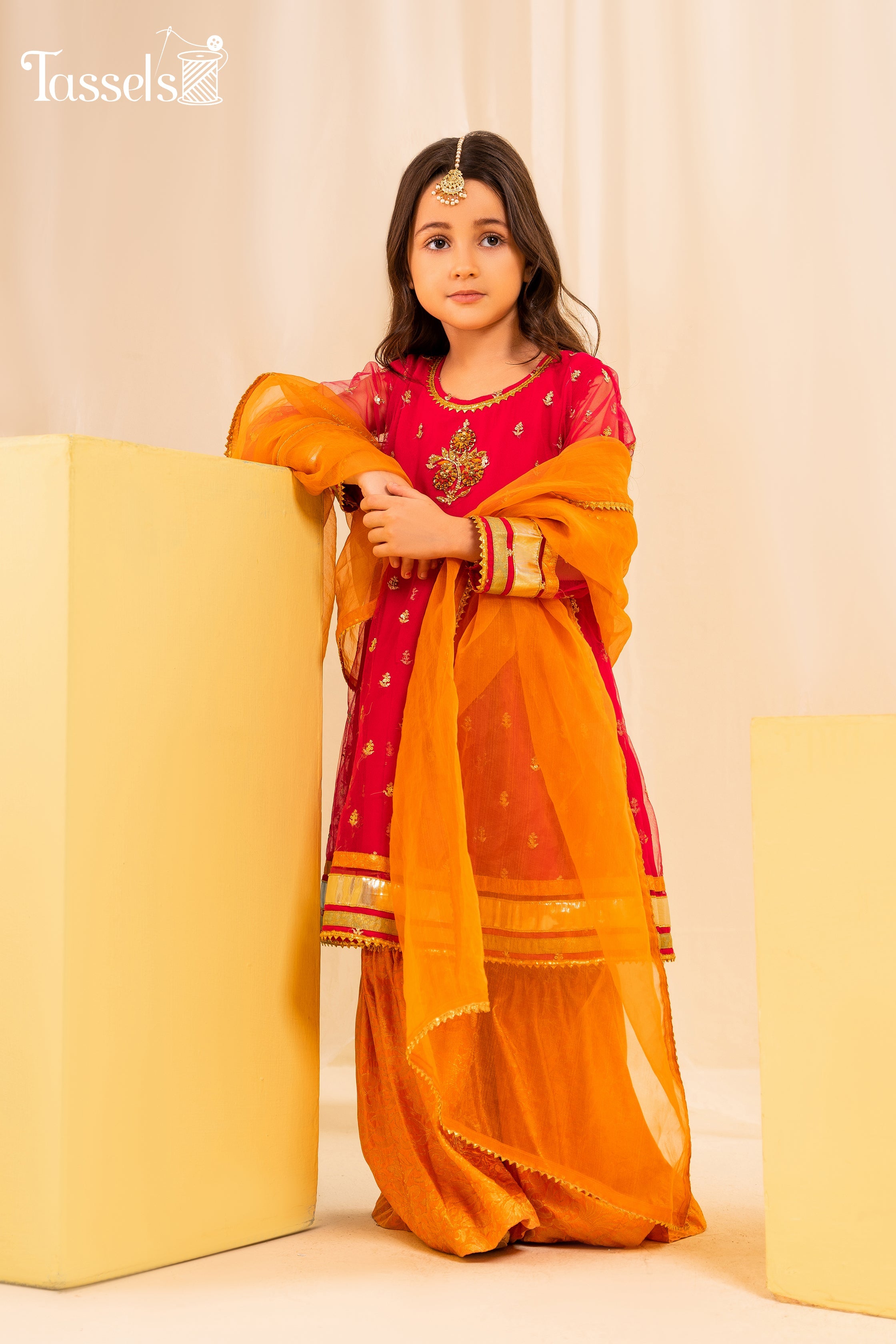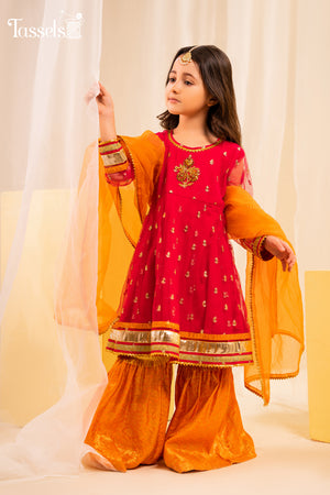 This Eid have the ultimate contemporary classic vibe you’ve been looking for with Gulabi - a zari embroidered soft net long frock with detailed embroidery on the neckline paired with self jamawar gharara and organza duppata