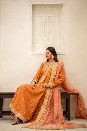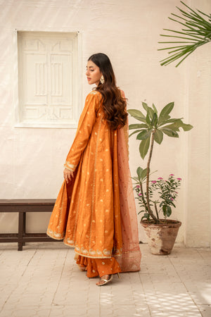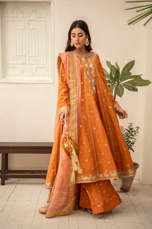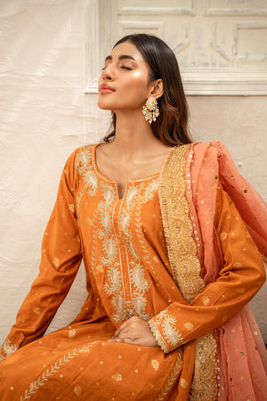 A refined ensemble in luxurious zarri cotton, with details zari embroidery paired with a beautifully detailed organza kamdani dupatta paired with zari cotton bottom — crafted for timeless grace.