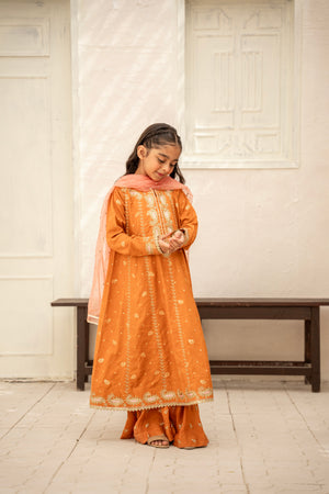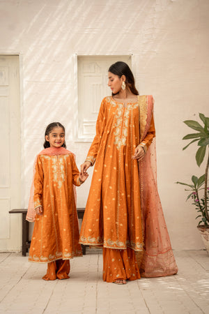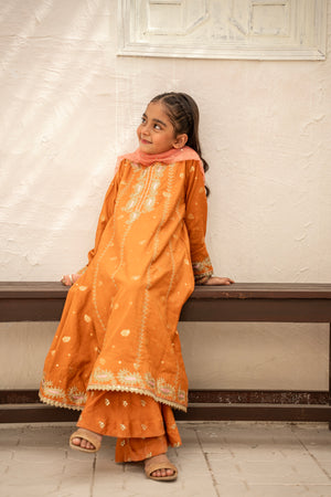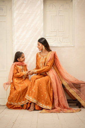 A refined ensemble in luxurious zarri cotton, with details zari embroidery paired with a beautifully detailed organza kamdani dupatta paired with zari cotton bottom — crafted for timeless grace.