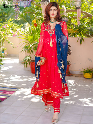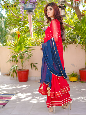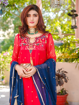 A captivating shade of red chiffon with lovely subtle gold zarri sheen is completely hand embelished with zardozi, sequins, and silk thread work in teal to provide a joyous flash of Colour. The hand worked neckline with tassels elevates your festive look. Beautiful kamdani teal dupaatta adds to the beauty of this outfit