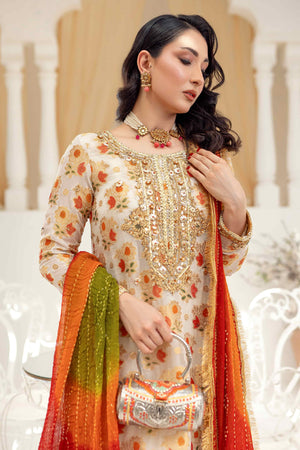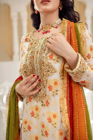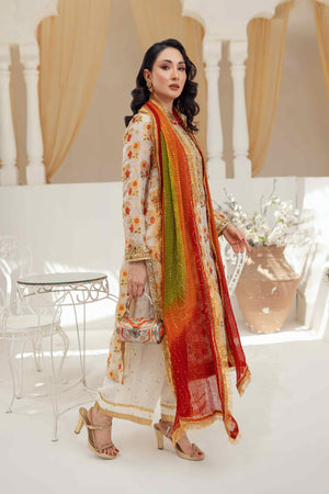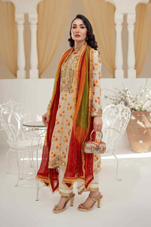 This exquisite ensemble features a self multi-zari chiffon shirt with intricate hand embroidery, combining gotta work, zari, and dabka detailing for a touch of luxury. The outfit is completed with a chundri dupatta featuring delicate kiran work, creating a beautifully traditional and stylish look.