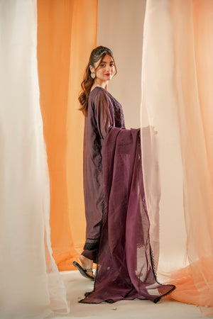 The article features a dark purple outfit with heavy black embroidery all over the shirt. Made from soft khadi cotton, the shirt showcases detailed embroidery on the daman, accented with milky laces and center laces, as well as on the sleeves. The neckline also features intricate detailing. The outfit is paired with matching trousers and a khadi net dupatta, creating a striking and elegant ensemble.