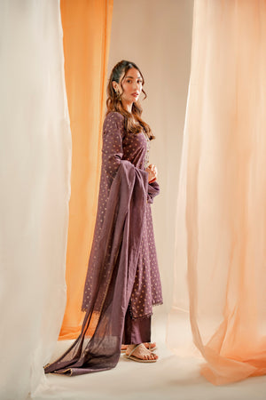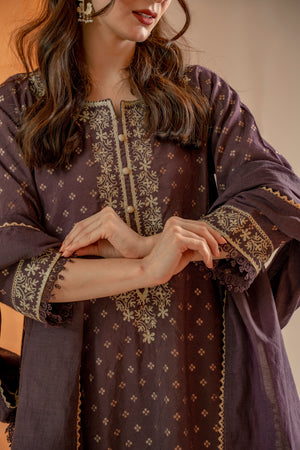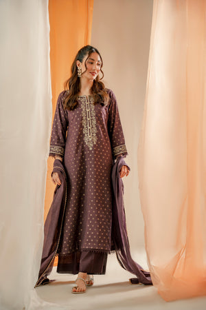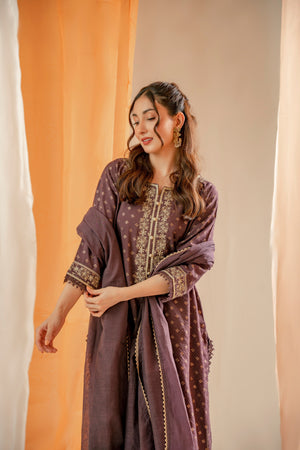 Make a statement with our stunning dark purple ensemble, crafted from elegant self-study fabric. Featuring intricate golden ARI embroidery on the neckline and sleeves, and adorned with GPO lace on the sleeves, this outfit exudes sophistication. Paired with a long cotton raw silk trouser and a matching dupatta, it's perfect for any special occasion.