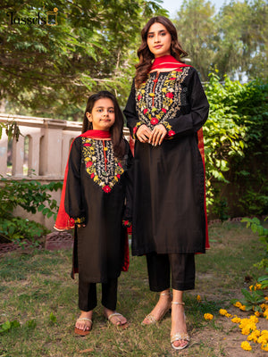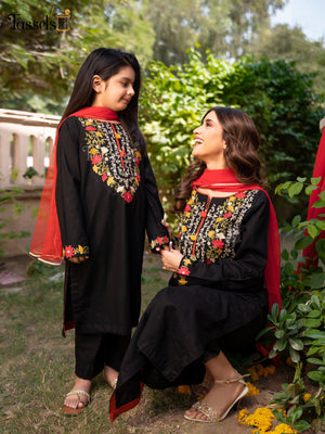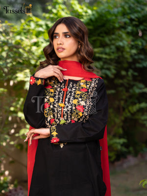 Raw cotton silk black multi embroidered cotton paired with chiffon duppata and straight pants.