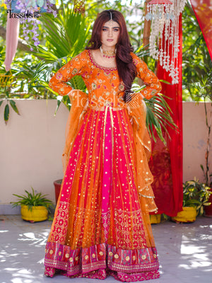 Featuring orange Front open kamdani net shirt with emblishment on body and beautifully crafted ctatpati and gola border. It's artistically paired with chiffon lehnga enhanced with sequined border, further butified by our beautiful kamdani dupaatta.