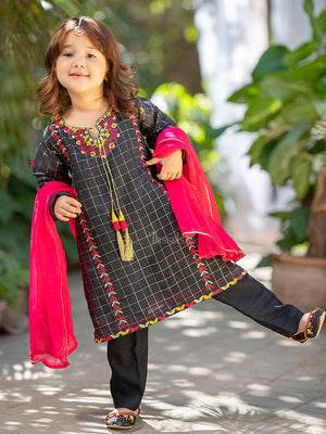 kanwal is a black zari cotton shirt with hot pink detailing on the neckline paired with black raw cotton silk pants and a hot pink chiffon dupatta for the vibrant pop of color.