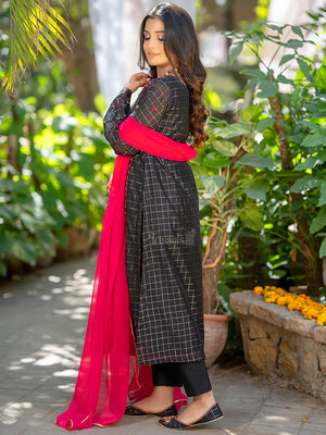 kanwal is a black zari cotton shirt with hot pink detailing on the neckline paired with black raw cotton silk pants and a hot pink chiffon dupatta for the vibrant pop of color.