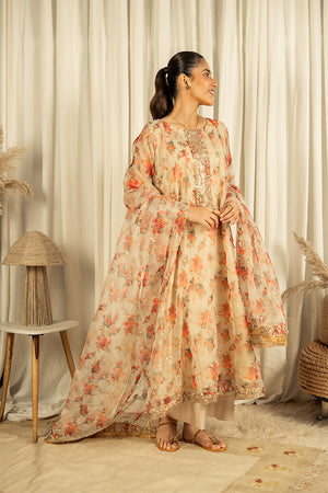 This beautiful outfit is made from soft, pure organza, featuring a vibrant print that adorns both the shirt and dupatta. It is paired with a comfortable soft cotton trouser and showcases detailed embellishments on the neckline. The outfit also includes attached lining for added comfort and elegance.