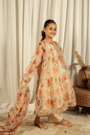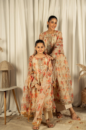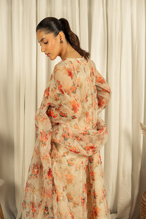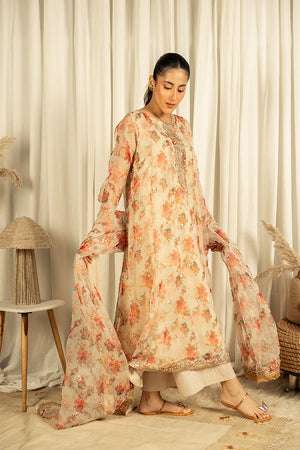 This beautiful outfit is made from soft, pure organza, featuring a vibrant print that adorns both the shirt and dupatta. It is paired with a comfortable soft cotton trouser and showcases detailed embellishments on the neckline. The outfit also includes attached lining for added comfort and elegance.