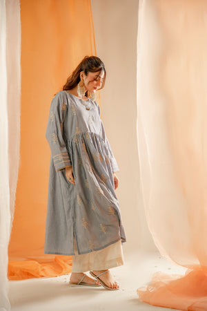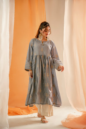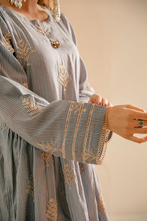 The article features a soft cotton lawn fabric outfit in gray lined fabric, consisting of a flared frock paired with trousers. The shirt is adorned with beautiful motif embroidery all over, adding an elegant touch to the ensemble.