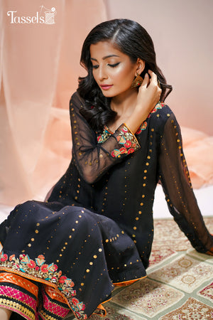 This exceptional ensemble with heavy kamdani embroidered chiffon shirt with heavy zardozi, thread and sequins work on sleeves , border and neckline. It comes with straight raw silk pants and colorful chundri duppata