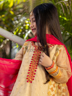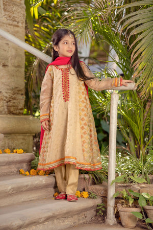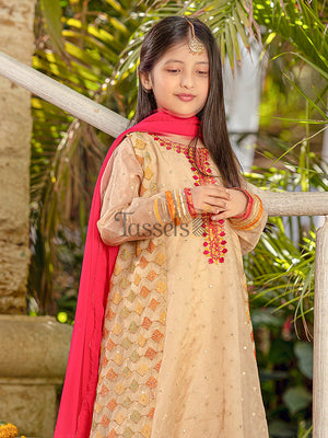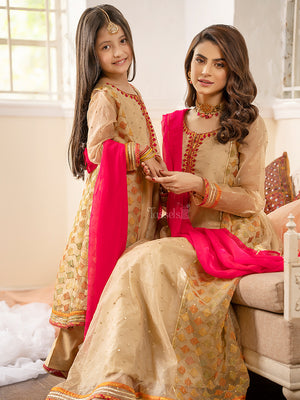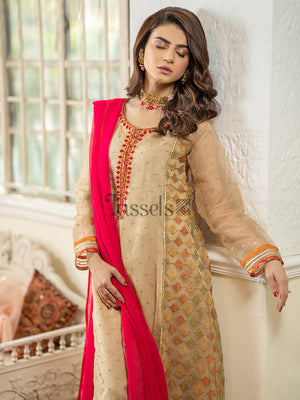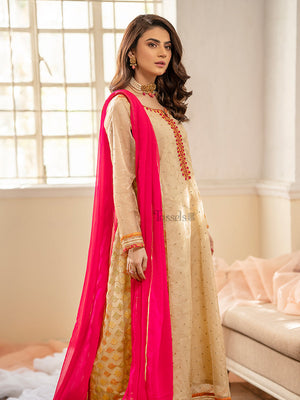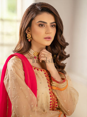 Mehrab is a sophisticated embroidered organza shirt along with raw cotton silk pants pairing with a florid pink chiffon dupatta.