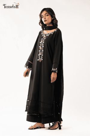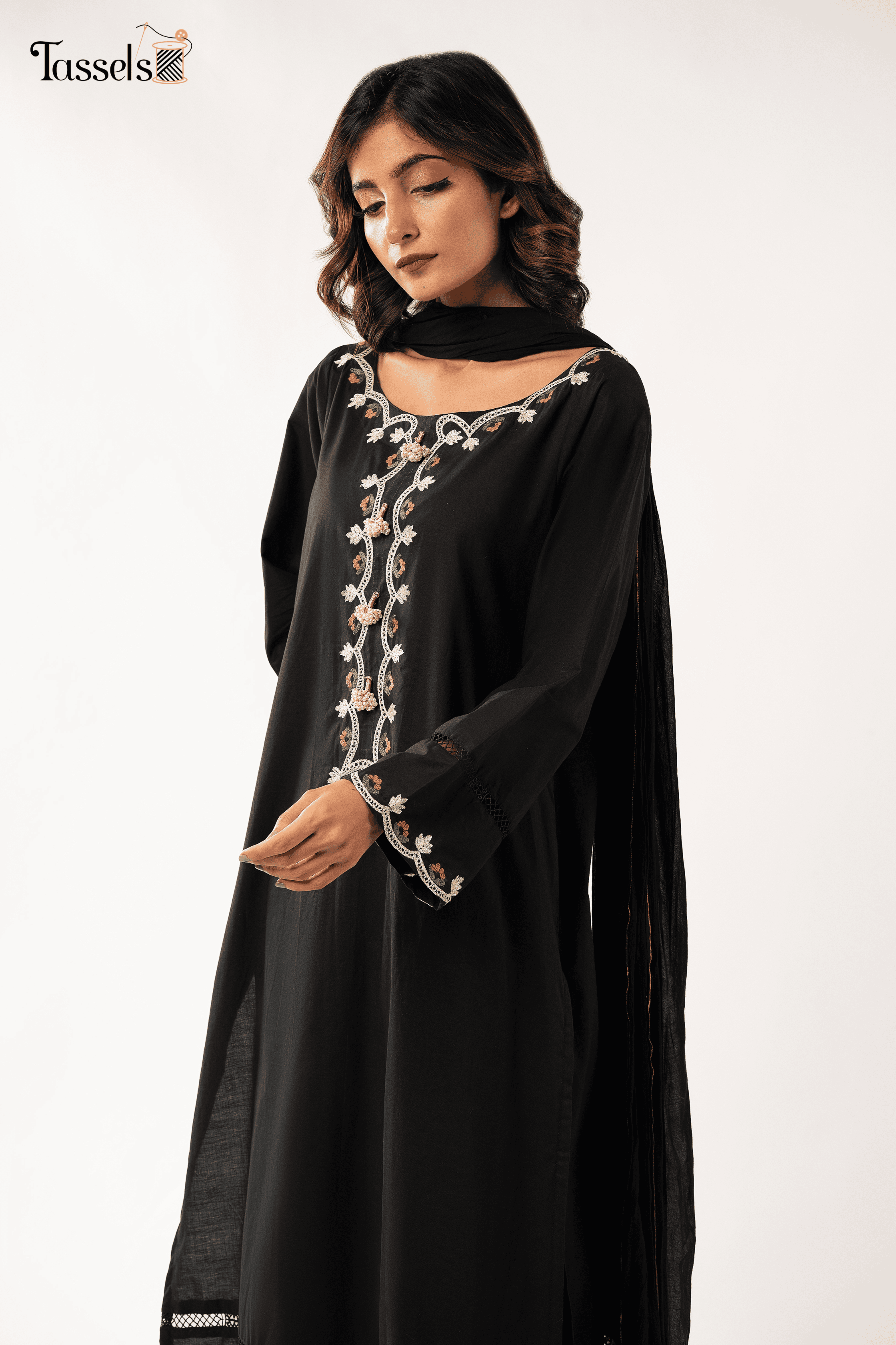 A very modern radiant pure cotton lawn outfit with arii embroidery on neckline and sleeves . Paired with a plain black embellished trouser and duppata to complete all over look