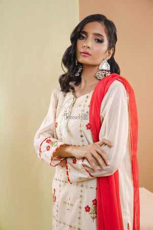 Zari and mirror work has been out of style for quite some time now, but we thought to give it a try and see if women are still finding it captivating and interesting. Hence, we are here with another signature article Motia. This three-piece comes with a long shirt, Jamawar Gharara, and a chiffon dupatta. In addition to the color combination, it has this subtle and classy fawn and peachy shade alongside golden zari work on the borders. This attire is perfect for any event because it has a comfortable fabric and sequins embroidery and mirrorwork all over it. Sequins embroidered flyer shirt with zari embroidery all over completed with gorgeous multi sequins borders, paired with straight jamawar pants and chiffon dupatta.