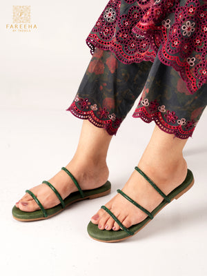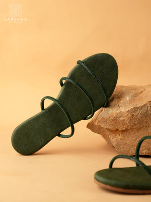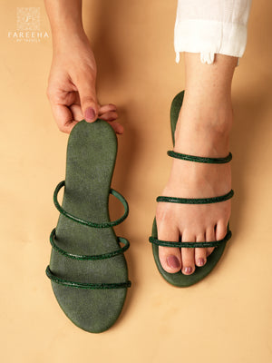 Green fancy flats with a shiny mesh on top, crafted with a green PU leather finish and a soft padded sole for comfort.