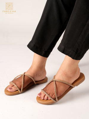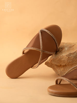 Mustard fancy flats featuring a stylish fishnet design with shiny golden mesh on top, crafted with a mustard brown PU leather finish and a soft padded sole for all-day comfort.
